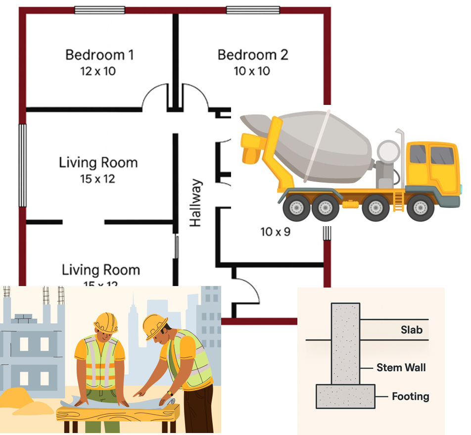 - Calculate the volume of concrete needed for footings, stem walls, and slab-on-grade foundations